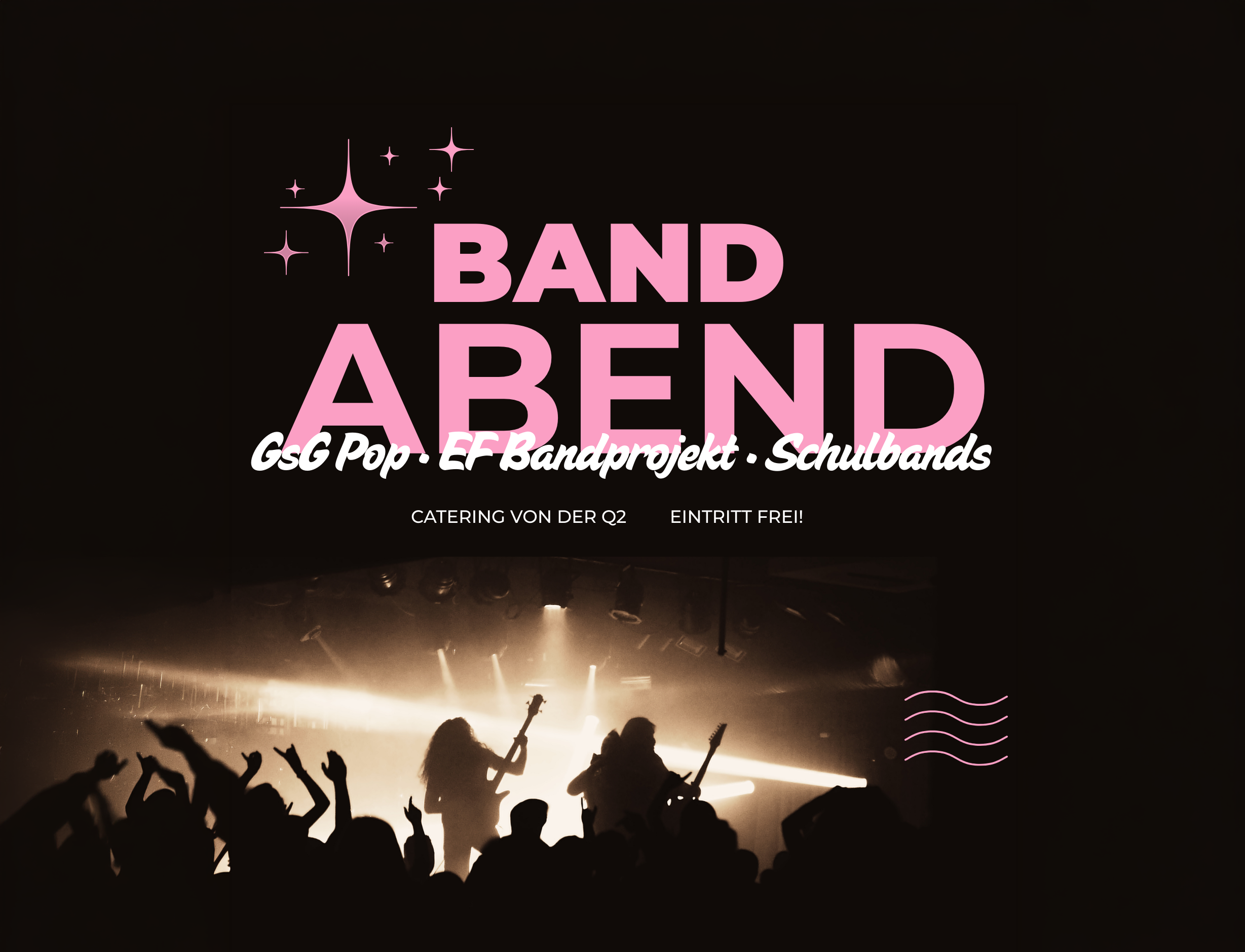 Am Donnertstag, 12. März 2026, ist es wieder so weit. Dann öffnet sich die Bühne im PZ für die verschiedenen Bandprojekte unserer Schule. Mit dabei sind GSG Pop, das EF-Bandprojekt und verschiedene Schulbands. Für das Catering sorgt die Q2. Beginn ist um 18.00 Uhr (Einlass ab 17.45).