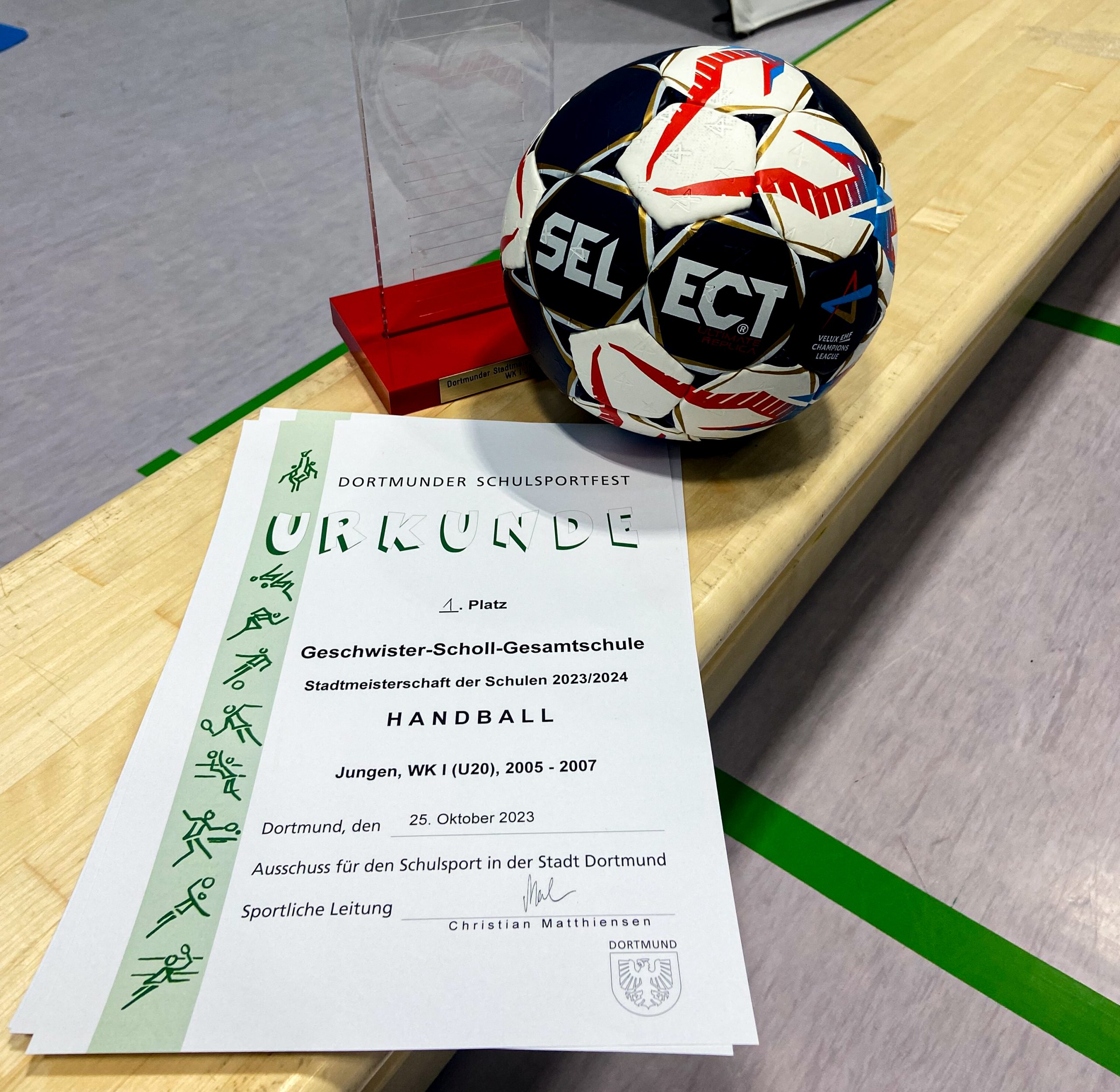 Es war ein dramatisches Match gegen das Team vom Mallinckrodt-Gymnasium. Am Ende sicherten sich unsere Jungen der WK1 (Jg. 2005-2007) den Titel als Stadtmeister im Handball. Nach spannenden 60 Minuten regulärer Spielzeit und zeitweise sechs Toren Rückstand konnte sich das Team um die Sportlehrerinnen Kim Bowman und Alica Delere mit 27:27 gerade noch in die Verlängerung retten. Am Ende war der Jubel groß. Es dauerte noch einmal 2×5 kräftezehrende Minuten bis zum Endstand von 28:32. Der Titel war erkämpft.