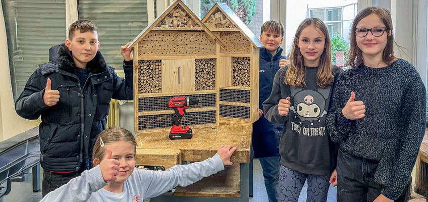 Hotels für Insekten entstehen derzeit (November 2025) in der Garten-Pause. Mit viel Geschick machen sich Schülerinnen und Schüler verschiedener Jahrgänge unter der Leitung von Johanna Hardenberg und Christina Schaepers ans Werk. Möglich wurde das Umweltprojekt durch einen Zuschuss von € 2000 vom Ministerium für Umwelt, Naturschutz und Verkehr NRW, um den sich die Gruppe erfolgreich beworben hatte.