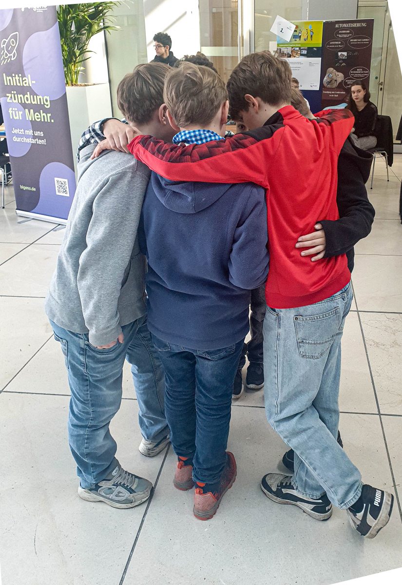 In der Landeshauptstadt hieß es dann: Bühne frei! Vor rund 200 Zuschauern präsentierten Erik Batschulat (5D) und Iyad Tazi (5E) ihre Ergebnisse mit einer Begeisterung, die ansteckend wirkte. Auch die anschließende Befragung am Projektstand meisterten die beiden unterstützt durch Luca Weimer (5D), Bahri Mert Özer (5D), Johann Leseberg (5E) und Rafael Göken (5F) mit Bravour. Fachkundig und souverän standen sie der Jury Rede und Antwort.