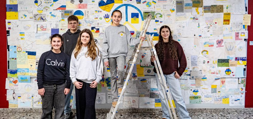 Seit Februar 2022 tobt der Krieg zwischen Russland und der Ukraine. Ein Ende ist nicht abzusehen. Kurz nach dem Überfall Russlands auf das südliche Nachbarland entstand die Idee, eine Wand neben dem Sekretariat als dauerhafte Solidaritätserklärung für das ukrainische Volk zu gestalten. Zahlreiche Schülerinen und Schüler beteiligten sich an der Aktion und schufen viele Karten, Bilder und Sprüche. Nun bekommt die Wand einen neuen, dauerhaften Ort. Auslöser war eine Begehung durch die Feuerwehr. Diese ordnete die Wand als Brandgefahr ein und bat um Entfernung. So wurde kurzerhand entschieden, die Wand fotografisch festzuhalten, auf brandgeschützte Folie zu übertragen und künftig im Erdgeschoss zu installieren. Doch zuvor musste die in die Jahre gekommen Wand restauriert werden. Ein Team aus Jugendlichen des sechsten und zehnten Jahrgangs griff zu Klebeband und Schere und verhalfen so der Solidaritätswand zu einem neuen, gepflegtem Outift.