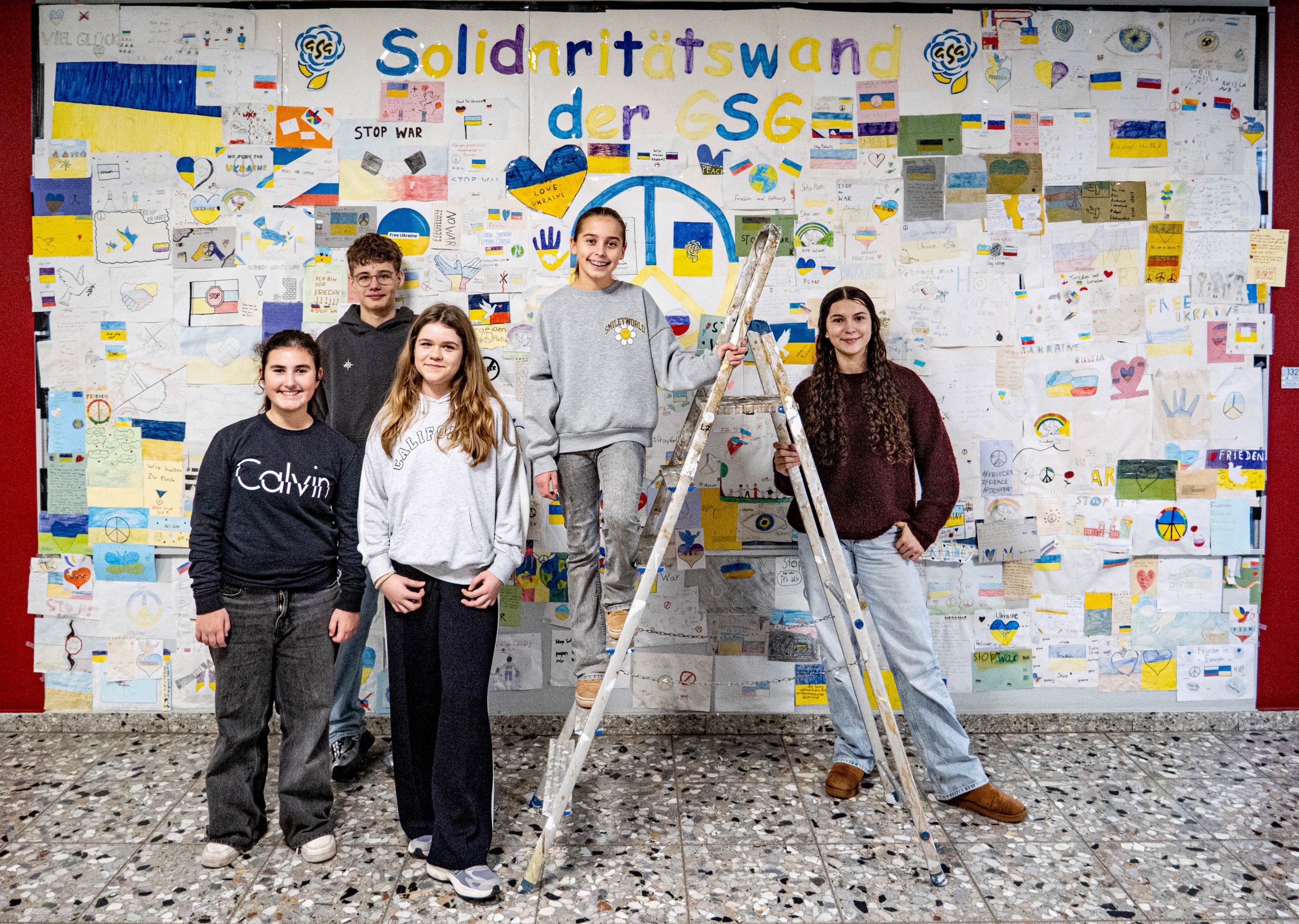 Seit Februar 2022 tobt der Krieg zwischen Russland und der Ukraine. Ein Ende ist nicht abzusehen. Kurz nach dem Überfall Russlands auf das südliche Nachbarland entstand die Idee, eine Wand neben dem Sekretariat als dauerhafte Solidaritätserklärung für das ukrainische Volk zu gestalten. Zahlreiche Schülerinen und Schüler beteiligten sich an der Aktion und schufen viele Karten, Bilder und Sprüche. Nun bekommt die Wand einen neuen, dauerhaften Ort. Auslöser war eine Begehung durch die Feuerwehr. Diese ordnete die Wand als Brandgefahr ein und bat um Entfernung. So wurde kurzerhand entschieden, die Wand fotografisch festzuhalten, auf brandgeschützte Folie zu übertragen und künftig im Erdgeschoss zu installieren. Doch zuvor musste die in die Jahre gekommen Wand restauriert werden. Ein Team aus Jugendlichen des sechsten und zehnten Jahrgangs griff zu Klebeband und Schere und verhalfen so der Solidaritätswand zu einem neuen, gepflegtem Outift.